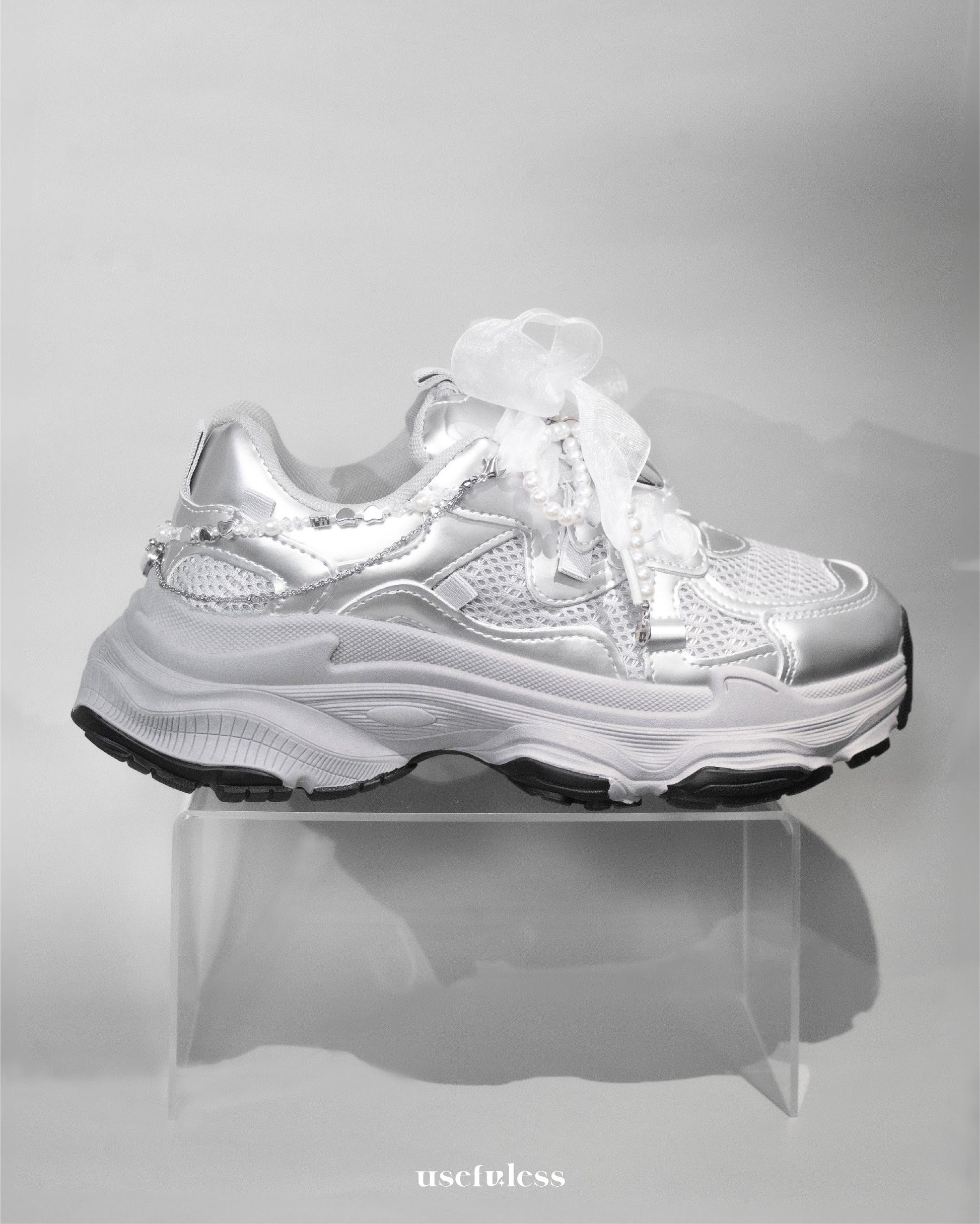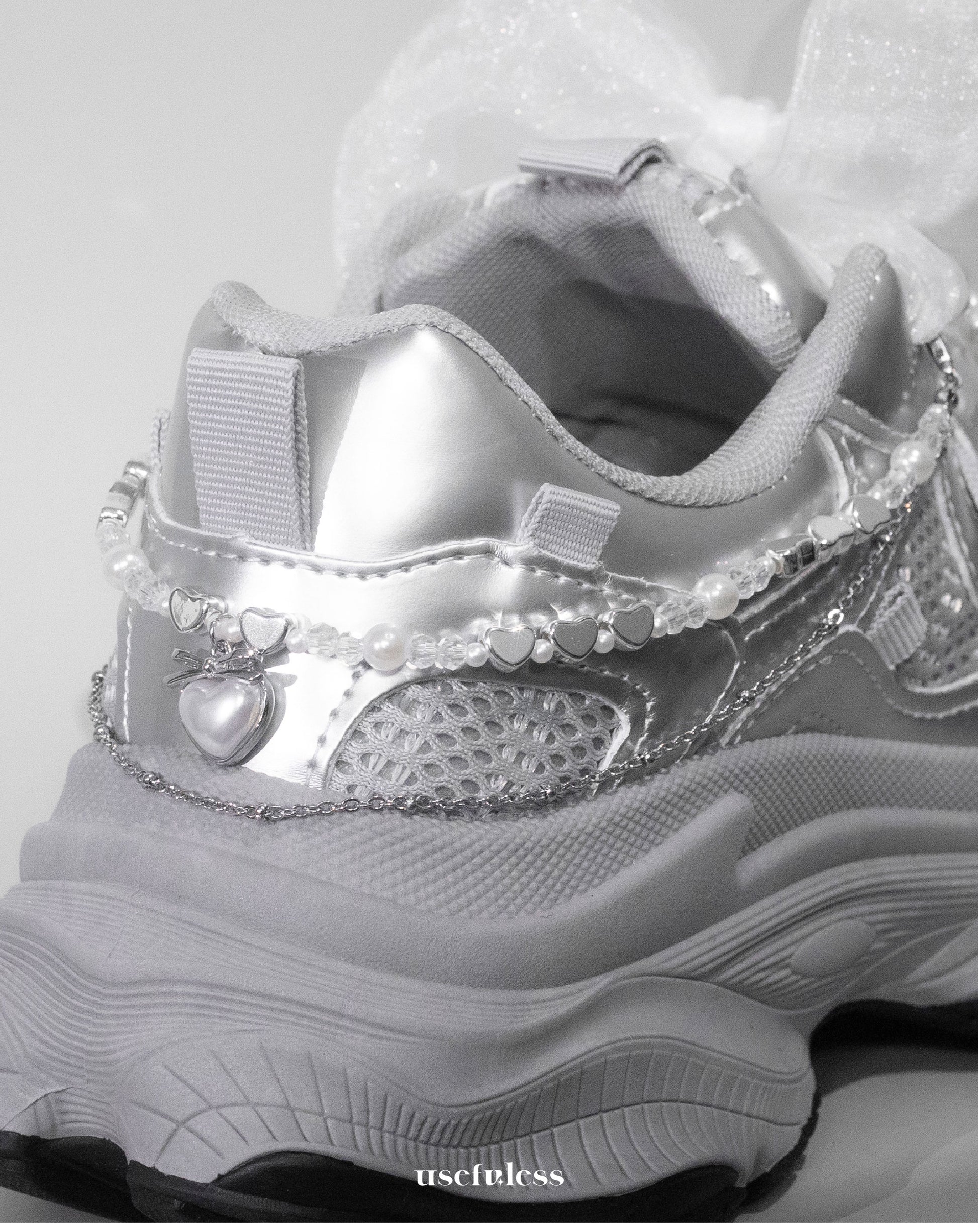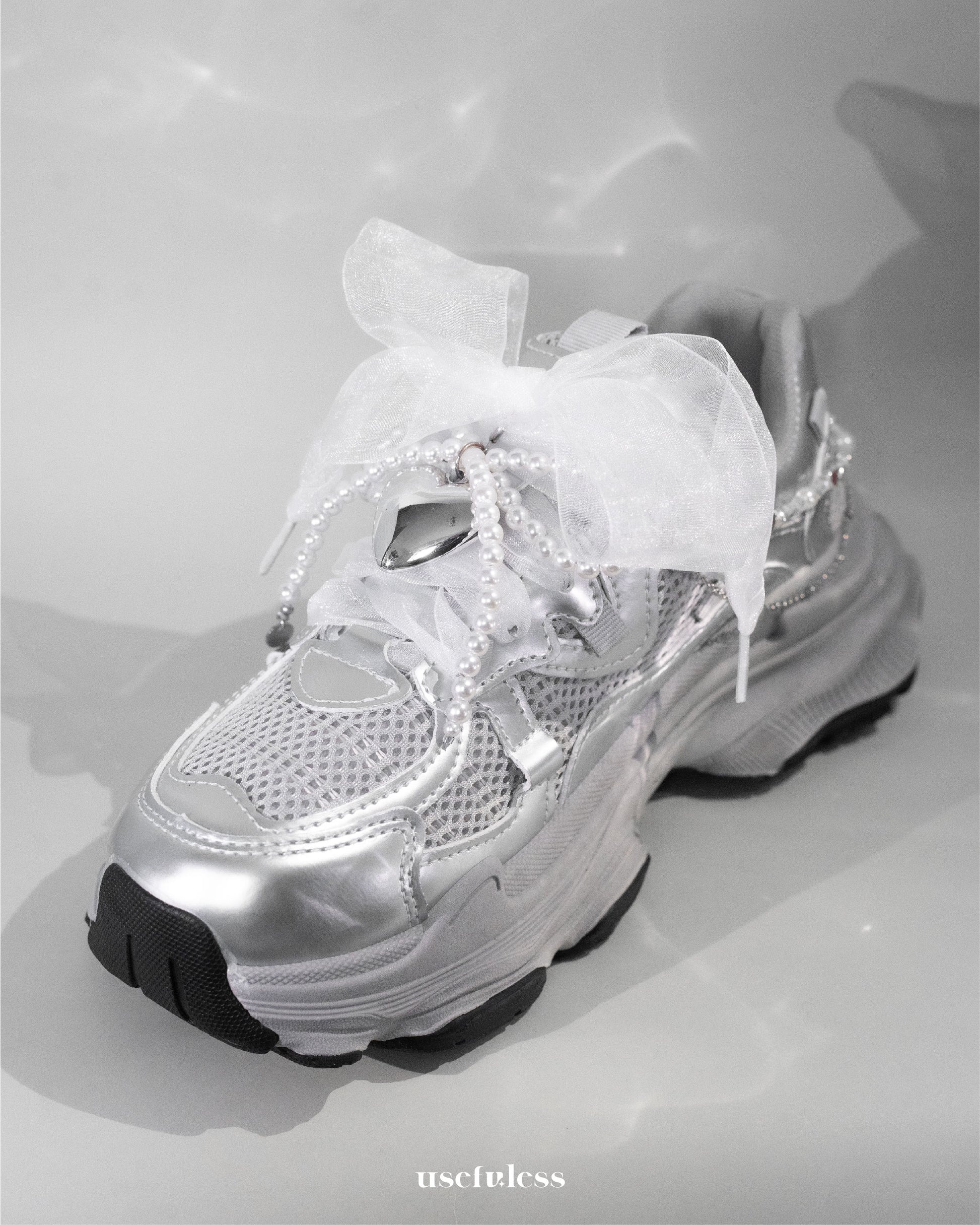 這款銀心珍珠蝴蝶結為您的運動鞋增添一抹優雅與個性,融合了復古珍珠、浪漫緞帶與閃耀愛心墜飾,打造獨特的「甜酷」風格。柔美的白色蝴蝶結與珠鍊垂墜設計,為日常穿搭增添層次感,無論是運動風、甜美風還是街頭潮流皆能輕鬆駕馭。