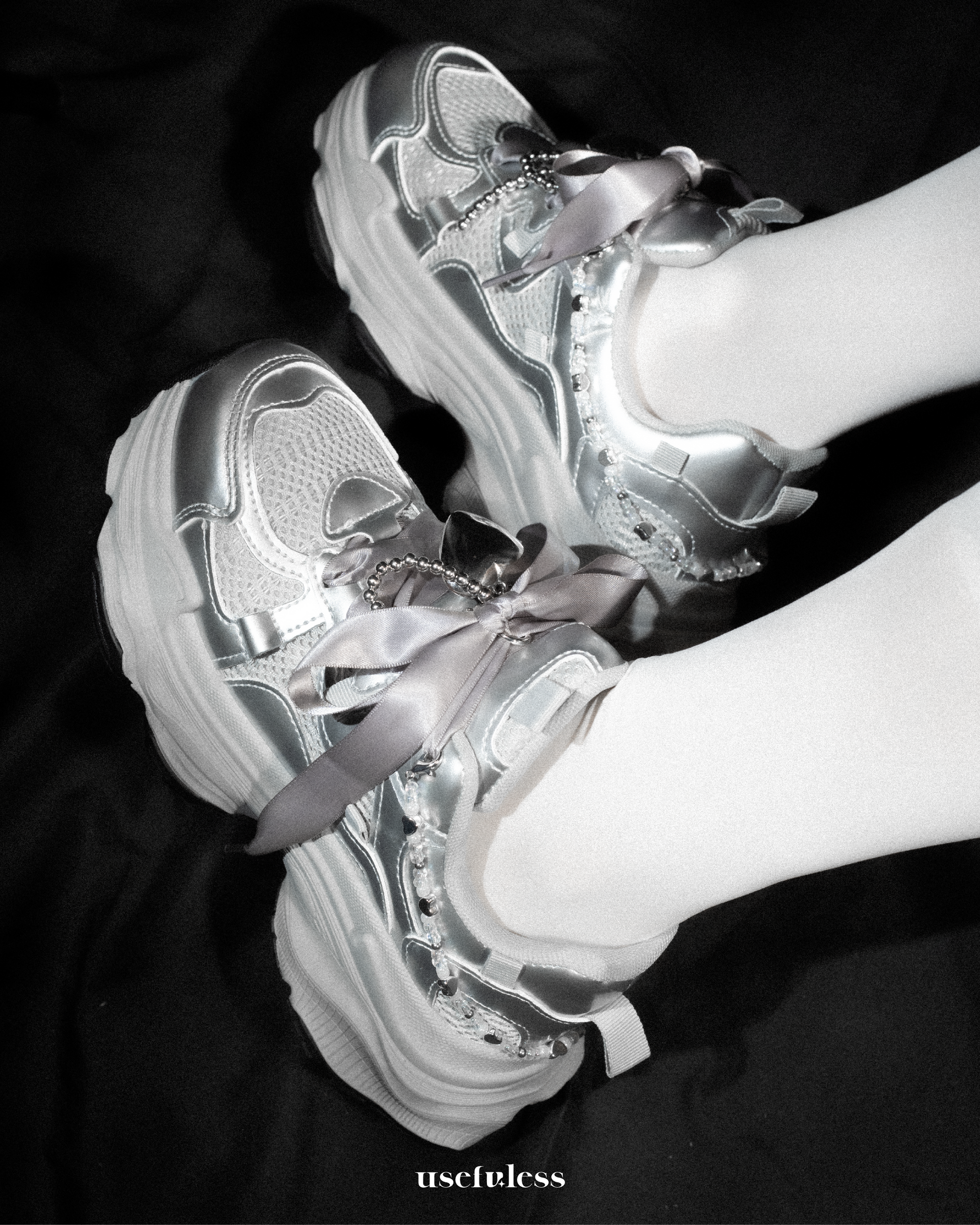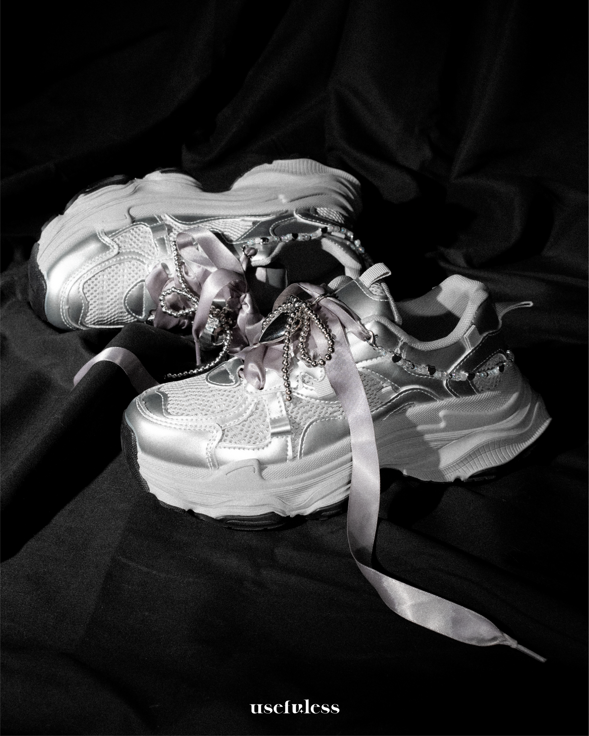 以冷冽銀色打造未來感時尚,幻夜銀心組合包為你的球鞋注入奢華與個性!金屬銀色調,為鞋子打造Y3K未來感,酷感與優雅兼具。銀色鞋飾搭配設計感鞋鏈,在低調與張揚之間取得完美平衡。